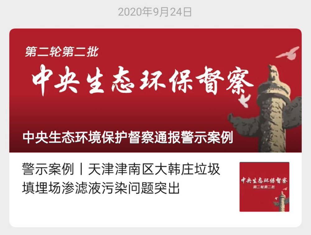 2、警示案例丨天津津南區(qū)大韓莊垃圾填埋場(chǎng)滲濾液污染問題突出,生態(tài)環(huán)境部,2020-09-24