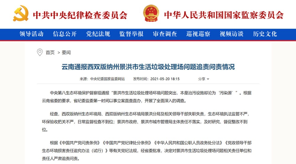 14、云南通報(bào)西雙版納州景洪市生活垃圾處理場(chǎng)問題追責(zé)問責(zé)情況,中央紀(jì)委國(guó)家監(jiān)委網(wǎng)站,2021-05-20