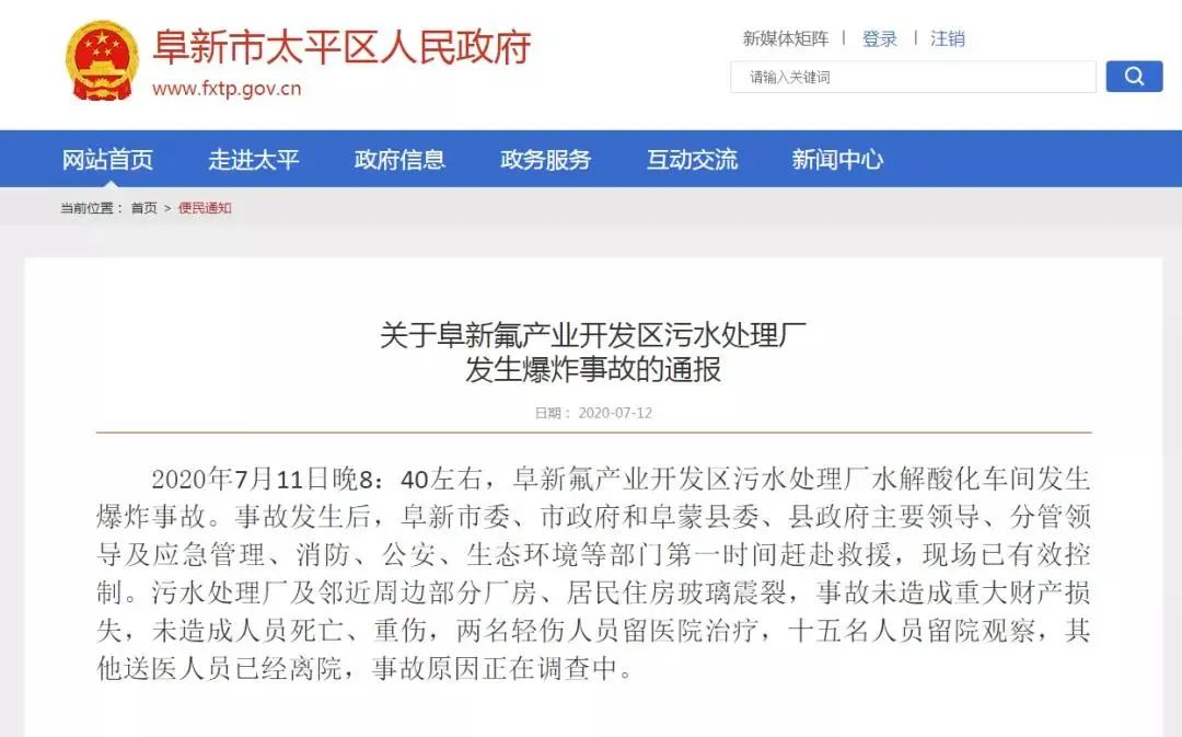事故發(fā)生后,阜新市委、市政府和阜蒙縣委、縣政府主要領(lǐng)導、分管領(lǐng)導及應急管理、消防、公安、生態(tài)環(huán)境等部門第一時間趕赴救援,現(xiàn)場已有效控制。污水處理廠及鄰近周邊部分廠房、居民住房玻璃震裂,事故未造成重大財產(chǎn)損失,未造成人員死亡、重傷,2名輕傷人員留醫(yī)院治療,15名人員留院觀察,其他送醫(yī)人員已經(jīng)離院,事故原因正在調(diào)查中。經(jīng)過調(diào)查,2020年9月28日,阜新市應急管理局發(fā)布了《阜新氟產(chǎn)業(yè)開發(fā)區(qū)碧波污水處理廠“7.11”一般爆炸事故調(diào)查報告》,對事故的原因做出了認定。