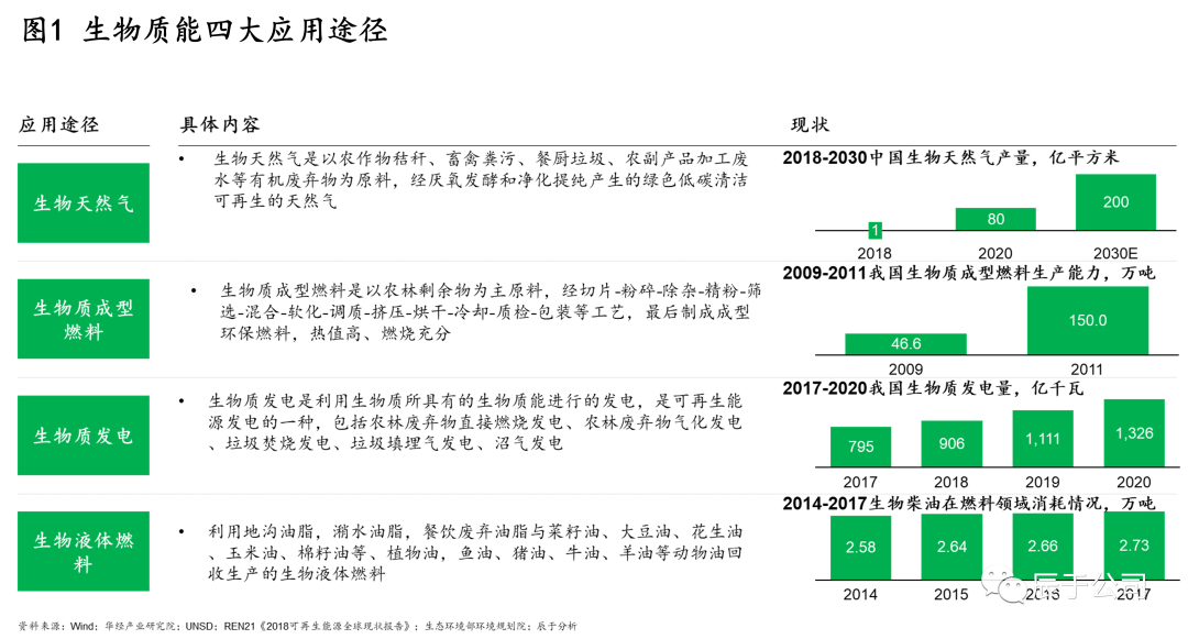 生物質(zhì)能是指太陽能以化學(xué)能形式儲(chǔ)存在生物質(zhì)中的能量形式,燒柴火便是對(duì)生物質(zhì)能的利用,自從人類學(xué)會(huì)了使用火,生物質(zhì)能就成為重要的能源來源之一。現(xiàn)代生物質(zhì)能行業(yè)進(jìn)一步對(duì)各種有機(jī)質(zhì)中的能源進(jìn)行加工和轉(zhuǎn)換,變成各類更易儲(chǔ)存、運(yùn)輸和使用的能源類型,具體可分為四大類別:生物天然氣,生物質(zhì)發(fā)電,生物質(zhì)成型燃料,生物液體燃料。這四類均已有一定的發(fā)展基礎(chǔ)(見圖1)。