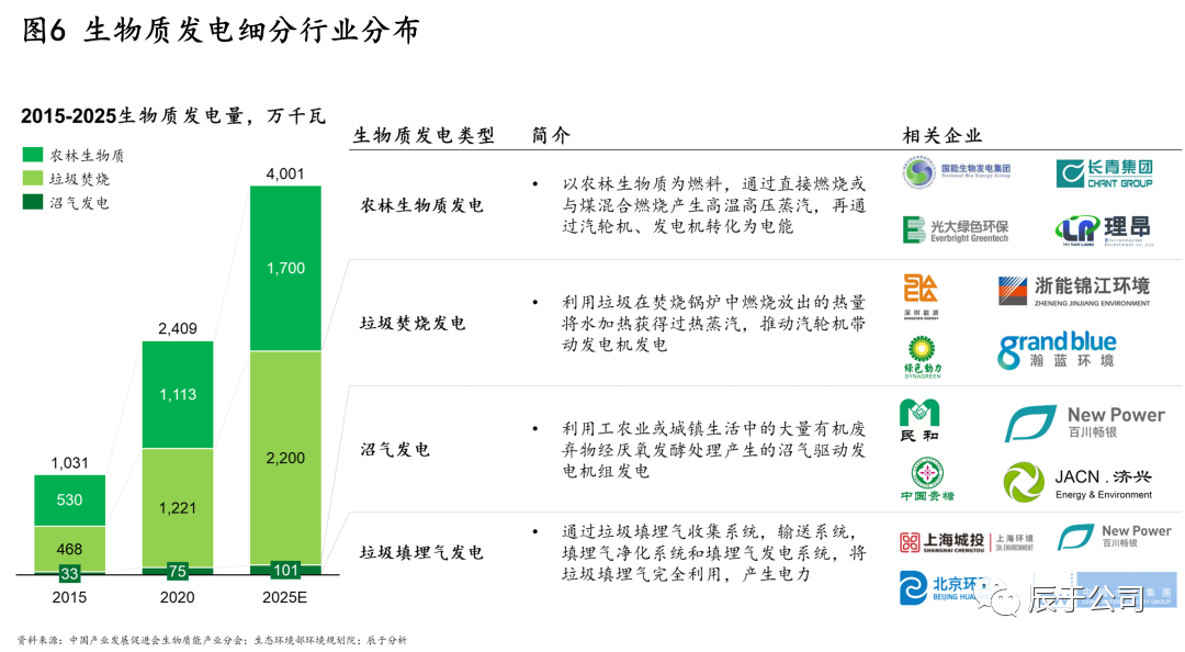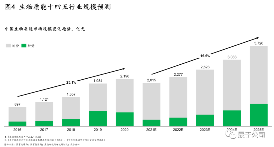辰于預(yù)測(cè),隨著“30·60”雙碳目標(biāo)引導(dǎo)下的能源革命和能源轉(zhuǎn)型,以及相關(guān)政策支持(例如明確對(duì)存量、增量的生物質(zhì)發(fā)電項(xiàng)目將按照新增不欠的原則由國家繼續(xù)給予電價(jià)補(bǔ)貼,并鼓勵(lì)金融機(jī)構(gòu)按照市場(chǎng)化原則對(duì)列入補(bǔ)助項(xiàng)目清單的企業(yè)予以支持),生物質(zhì)能市場(chǎng)“十四五”期間的投資和運(yùn)營(yíng)規(guī)模將持續(xù)提升,復(fù)合增長(zhǎng)率16.6%,到2025年達(dá)到3700億元規(guī)模(見圖4)。投資方面,預(yù)計(jì)生物天然氣投資額最高,增長(zhǎng)也最快;運(yùn)營(yíng)方面,生物質(zhì)發(fā)電占比最高,但生物天然氣的增速最快。