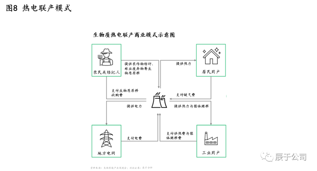 盈利壓力一方面將促進(jìn)行業(yè)洗牌,在優(yōu)勝劣汰的過程中預(yù)計(jì)行業(yè)集中度將逐步提升,民營(yíng)企業(yè)的份額會(huì)逐步降低;另一方面,行業(yè)也在積極探索新的商業(yè)模式,提升項(xiàng)目盈利性,其中熱電聯(lián)產(chǎn)是主要的方向(見圖8)。相比單純發(fā)電賣錢,熱電聯(lián)產(chǎn)在發(fā)電過程中產(chǎn)生的剩余熱量也通過向居民或工業(yè)用戶供熱的方式來獲取收入,能量利用率得到提升,經(jīng)濟(jì)效益和社會(huì)效益都更好。