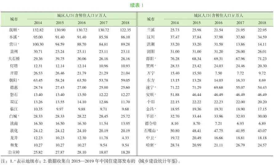 為了獲得收縮型城市的生活垃圾產(chǎn)生特征,首先對(duì)全國(guó)地級(jí)市、縣級(jí)市進(jìn)行了總體分析。收縮型城市目前還缺乏統(tǒng)一定義,本研究從生活垃圾管理角度出發(fā),根據(jù)我國(guó)《城鄉(xiāng)建設(shè)統(tǒng)計(jì)年鑒》,以城區(qū)人口(含城區(qū)暫住人口)在2013—2018年間持續(xù)減少超過5%為基本衡量依據(jù)??紤]到統(tǒng)計(jì)口徑的差異,進(jìn)一步參考各地的統(tǒng)計(jì)公報(bào)與年鑒,排除人口顯著流入的城市,得到典型收縮型城市共計(jì)49個(gè),如表1~表3所示。表1~表3中,有些地級(jí)市和縣級(jí)市為隸屬關(guān)系,但這些地級(jí)市的統(tǒng)計(jì)數(shù)據(jù)均對(duì)應(yīng)主城區(qū),并不包含下轄縣級(jí)市城區(qū)的人口或垃圾量。