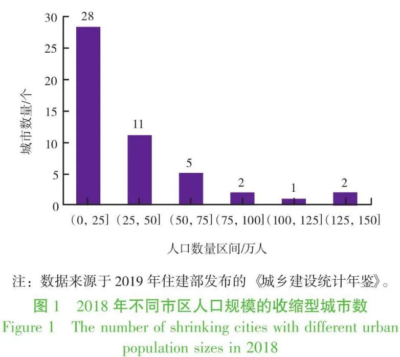 根據(jù)2019年住建部發(fā)布的《城鄉(xiāng)建設(shè)統(tǒng)計(jì)年鑒》中數(shù)據(jù),分析了2018年全國(guó)49個(gè)收縮型城市的市區(qū)人口與垃圾清運(yùn)量及其處理情況,發(fā)現(xiàn)這些城市具有如下共同特征: 1)大多數(shù)為中小城市。除鞍山、撫順、大慶3座東北地區(qū)的大城市外,其余城市城區(qū)人口不足100萬(wàn)人,屬于中小城市。以2018年人口為參考,中等城市有7座,城區(qū)人口不足50萬(wàn)的小城市有39座(圖1)。這反映了城市收縮的特點(diǎn),小城市的就業(yè)機(jī)會(huì)、發(fā)展前景和生活資源不如大城市,會(huì)導(dǎo)致人口向大城市流動(dòng)。