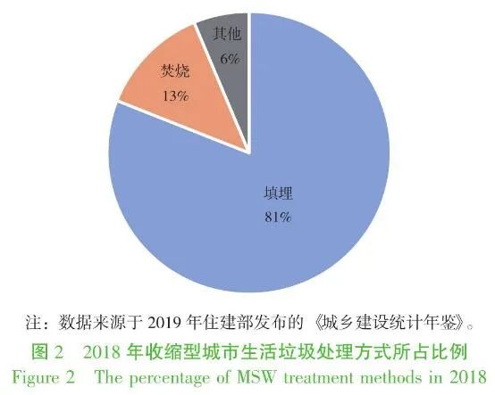 2)垃圾清運(yùn)量有增有減。我國(guó)大多數(shù)收縮型城市的經(jīng)濟(jì)仍在發(fā)展,這是與發(fā)達(dá)國(guó)家收縮型城市的一個(gè)顯著區(qū)別,但隨著人口數(shù)量的降低,垃圾清運(yùn)總量在不同程度地減少。然而,也有不少城市(例如大石橋、大慶、漢川等)的垃圾清運(yùn)量還在持續(xù)增加,這主要因?yàn)檫@些城市垃圾清運(yùn)服務(wù)的覆蓋范圍不斷擴(kuò)大,一些郊區(qū)、鄉(xiāng)鎮(zhèn)垃圾也納入到統(tǒng)一的清運(yùn)體系中。 3)人均垃圾清運(yùn)量較低。收縮型城市的垃圾清運(yùn)量基本代表了清運(yùn)服務(wù)覆蓋區(qū)域的垃圾產(chǎn)生量(僅少量可回收物未進(jìn)入清運(yùn)系統(tǒng))。收縮型城市的人均垃圾清運(yùn)量為(1.23±0.35)kg/d。值得注意的是,許多城市的垃圾清運(yùn)服務(wù)范圍不僅覆蓋城區(qū)人口,也覆蓋了郊區(qū)和部分鄉(xiāng)村地區(qū),因此人均清運(yùn)量數(shù)值偏高(城區(qū)人口少于垃圾清運(yùn)服務(wù)人口)。一些地級(jí)市的垃圾清運(yùn)量和城區(qū)人口有較好的對(duì)應(yīng)關(guān)系,其人均垃圾清運(yùn)量多在0.8~1.1 kg/d,低于發(fā)達(dá)城市。 4)垃圾處理以填埋為主。這49座城市清運(yùn)的生活垃圾基本實(shí)現(xiàn)了無(wú)害化處理,但處理以衛(wèi)生填埋方式為主,共有填埋場(chǎng)42座,而焚燒廠僅7座(主要在四川、江蘇),其他設(shè)施4座。從處理量上看,填埋方式也占約81%(圖2),比例顯著高于全國(guó)平均水平(40%),難以滿足可持續(xù)發(fā)展的要求。