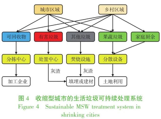 針對(duì)這一趨勢(shì),收縮型城市生活垃圾管理應(yīng)采用更為靈活的策略,在鄉(xiāng)村地區(qū)重點(diǎn)開展廚余垃圾的就地利用,在城市地區(qū)生活垃圾分為可回收物、有害垃圾和其他垃圾,而將果蔬垃圾作為重點(diǎn)廚余垃圾管理,同時(shí)加強(qiáng)源頭減量和適度分散處理,構(gòu)建以焚燒為核心的彈性處理系統(tǒng)。