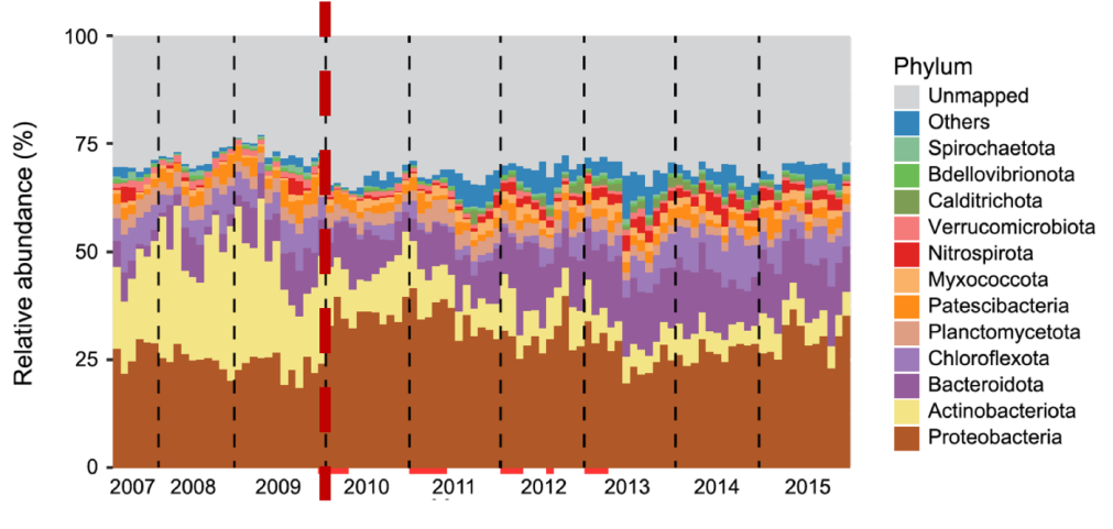 香港大學(xué)張彤教授的團(tuán)隊(duì)在2007年6月到2015年 12月期間,每個(gè)月都會(huì)在香港沙田污水處理廠采集活性污泥的樣本。他們想看看,復(fù)雜的活性污泥微生物群落,在這么長(zhǎng)的時(shí)間跨度內(nèi),在經(jīng)歷各種環(huán)境條件的變動(dòng)時(shí),這個(gè)系統(tǒng)是怎么演變的。