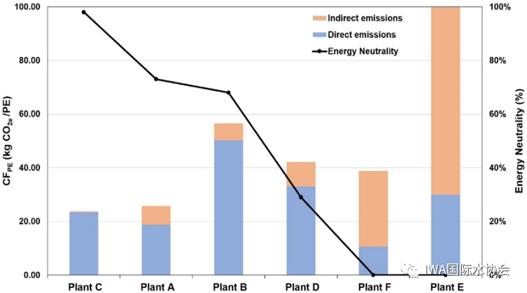 如下圖所示,這兩個(gè)參數(shù)之間有非常顯著的相關(guān)性。這13個(gè)污水廠可以分為兩組,分別為間接/直接排放比小于50%和大于200%兩種情況,分別位于該圖的左右兩側(cè)。作者認(rèn)為,通過厭氧消化回收沼氣來回收能量是導(dǎo)致左側(cè)污水廠該比值比較小的主要原因。50-200%區(qū)間的污水廠通過太陽能和風(fēng)能等可再生能源抵消了一小部分能耗。