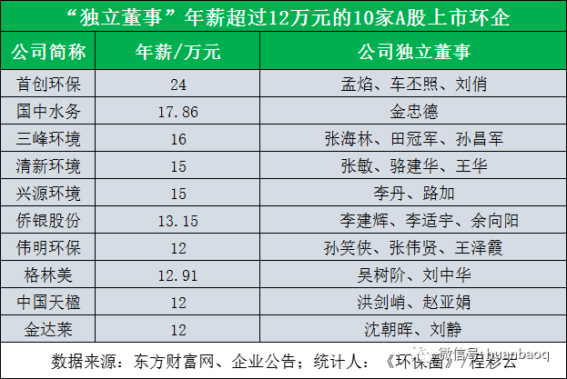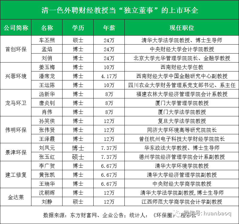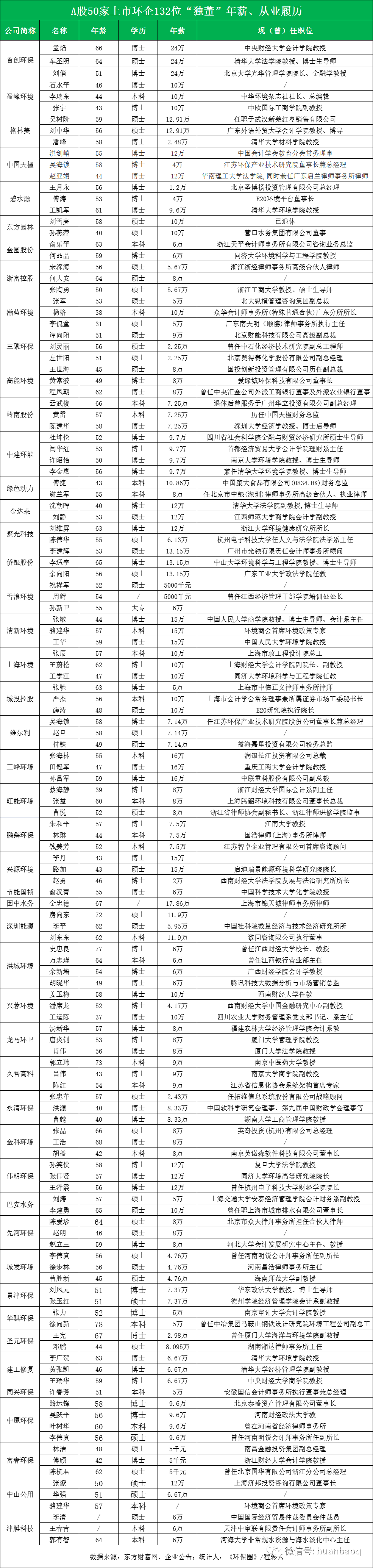 揭秘A股50家上市環(huán)企的132位獨董:簡單了解獨董職責(zé)之后,我們回歸環(huán)保行業(yè),談一談A股上市環(huán)企的獨立董事們。筆者查閱資料發(fā)現(xiàn),自從康美案落定后,A股上市環(huán)企中,還真有兩家上市環(huán)企獨董因個人原因提交了辭呈。一位是年薪僅5千元的富春環(huán)保獨立董事林潔,另一位是新三板公司博芳環(huán)保的獨立董事陳麗紅。兩個人都是因為“個人原因”提交的辭呈,巧合的是,辭職的時間都是在康美處罰案落地前后。排除這兩家之外,《環(huán)保圈》發(fā)現(xiàn),A股上市環(huán)企絕大多數(shù)獨立董事都比較淡定,沒有在敏感時期提出辭職。為了讓讀者進(jìn)一步了解上市環(huán)企獨董的背景,《環(huán)保圈》對A股50家上市環(huán)企中132位獨立董事進(jìn)行了逐一統(tǒng)計,從而進(jìn)一步觀察他們年薪、學(xué)歷、背景、從業(yè)經(jīng)歷。首先,每家上市環(huán)企外聘的獨立董事數(shù)量幾乎是一樣的,都是3-4個。這跟證監(jiān)會要求有關(guān),“上市公司獨立董事人數(shù)不得少于董事會成員的1/3”。由于環(huán)保上市企業(yè)本身規(guī)模不大,董事會成員大多在10人左右,所以匹配3-4個獨立董事最為合適。其次,從薪資上看,每家企業(yè)外聘獨立董事的工資也是不一樣的。最高的當(dāng)屬首創(chuàng)環(huán)保,分別給予孟焰、車丕照、劉俏教授年薪24萬/年;其次是國中水務(wù),其獨立董事金忠德薪酬17.86萬元/年;再者還有三峰環(huán)境、清新環(huán)境、興源環(huán)境、偉明環(huán)保、僑銀股份、格林美,中國天楹、金達(dá)萊等,這幾家企業(yè)對獨董也非常大方,年薪都在12萬/年以上,平均每月收入1萬元左右。
