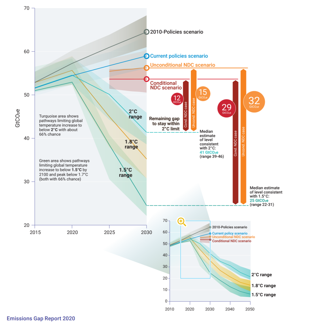 NDCs與預(yù)期溫控目標(biāo)的差距  來源:Emissions Gap Report 2020