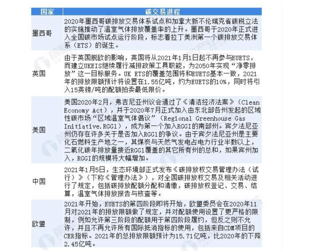 全球主要國家碳交易進(jìn)程  資料來源:前瞻產(chǎn)業(yè)研究院整理