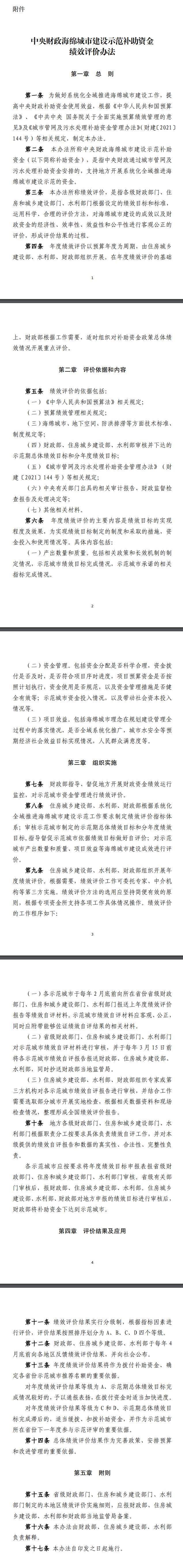 為做好系統(tǒng)化全域推進海綿城市建設工作,提高中央財政補助資金使用效益,根據《中華人民共和國預算法》《中共中央 國務院關于全面實施預算績效管理的意見》及《城市管網及污水處理補助資金管理辦法》(財建〔2021〕144號)等相關規(guī)定,我們制定了《中央財政海綿城市建設示范補助資金績效評價辦法》,詳見附件。