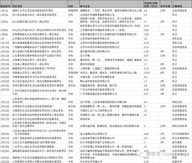 1月,固廢市場(chǎng)共釋放出垃圾焚燒項(xiàng)目11個(gè),涉及投資額超過(guò)50億。