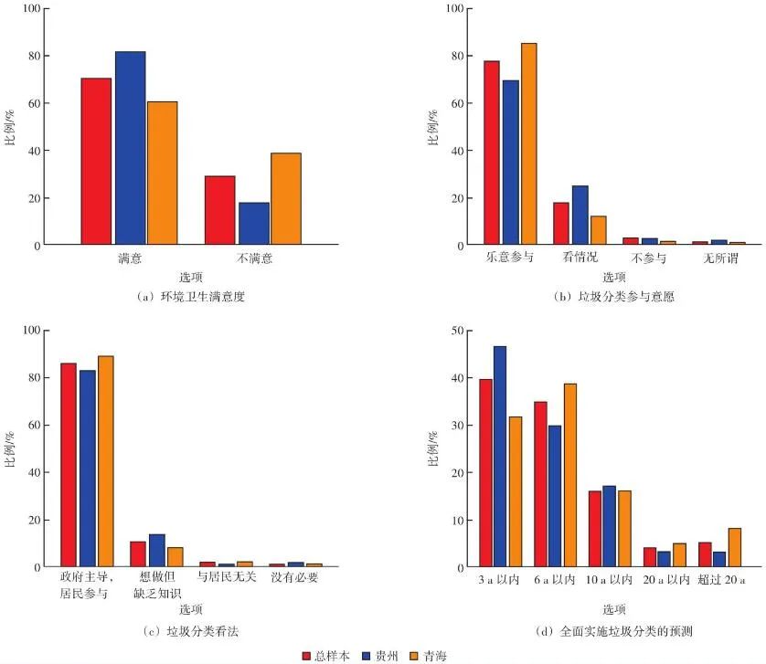 在垃圾問(wèn)題的責(zé)任歸屬感知方面,結(jié)果排序依次為垃圾排放者、政府、環(huán)衛(wèi)部門(mén)、宣傳媒體和商品生產(chǎn)者,青海、貴州兩地樣本的調(diào)查結(jié)果分布也總體一致。垃圾排放者的選擇率最高(51%),多數(shù)居民認(rèn)同排放者的責(zé)任和義務(wù),要把握建立排放者責(zé)任制度的良好契機(jī),盡快明確排放者責(zé)任,完善監(jiān)督體系。其次為政府(23%)和環(huán)衛(wèi)(16%)等部門(mén),作為公共服務(wù)與社會(huì)資源的主要提供者和分配者,要承擔(dān)垃圾治理的主導(dǎo)和推動(dòng)責(zé)任,通過(guò)有效整合資源和提供優(yōu)質(zhì)公共服務(wù)引導(dǎo)多元主體的共同參與。此外,宣傳媒體的選擇率較低(5%),但要承擔(dān)宣傳引導(dǎo)與輿論監(jiān)督責(zé)任,成為民眾獲取相關(guān)信息的渠道和載體,發(fā)揮輿論監(jiān)督的積極作用。最后,商品生產(chǎn)者(5%)是民眾容易忽視的責(zé)任對(duì)象,明確并監(jiān)督其責(zé)任是解決垃圾問(wèn)題的客觀(guān)需要。建議西部地區(qū)在推行垃圾分類(lèi)的過(guò)程中,在廢物治理領(lǐng)域逐漸推行生產(chǎn)者責(zé)任延伸(EPR)制度,有助于構(gòu)建良性的廢物回收體系,促進(jìn)企業(yè)的資源化處理。