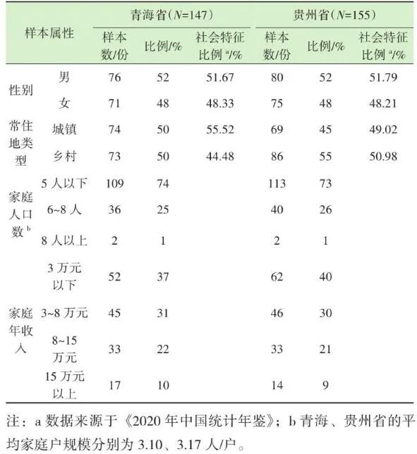共回收302份有效問(wèn)卷,其中青海147份,貴州155份,調(diào)查對(duì)象以中學(xué)生為主,涉及不同性別、家庭收入水平、居住環(huán)境的各類(lèi)受訪(fǎng)者。其中男女比例接近1∶1,性別占比分布均衡;地域分布跨度較廣,涵蓋不同居住地類(lèi)型;與當(dāng)?shù)氐募彝ト丝诮Y(jié)構(gòu)特征相符;家庭收入水平涵蓋低中高各層次。整體上,調(diào)查樣本代表的社會(huì)屬性特征分別和西北、西南地區(qū)的分布特征一致,調(diào)查數(shù)據(jù)的代表性較好。