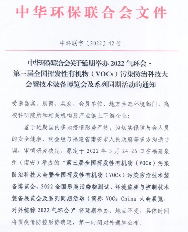 中華環(huán)保聯(lián)合會關于延期舉辦2022氣環(huán)會●第三屆全國揮發(fā)性有機物( VOCs )污染防治科技大會暨技術裝備博覽會及系列同期活動的通知
