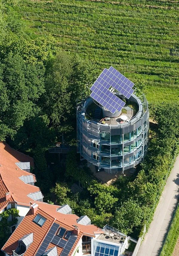 在德國巴登符騰堡州弗萊堡市內有一片綠色的建筑“森林”,包含150棟可以進行“光合作用”的再生能源屋。其中一座建筑尤為特別,通過控制程序,它能夠像向日葵一樣,跟隨太陽位置進行旋轉,從而保證屋頂和立面的太陽能光電板組最大化地實現(xiàn)光電轉換。