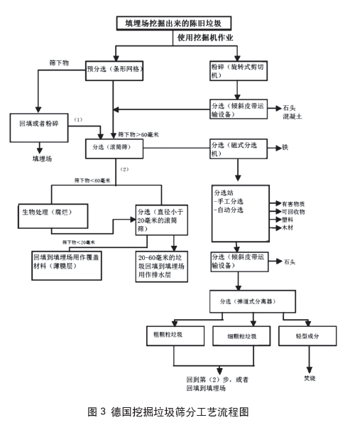 德國使用挖掘機對3米厚的覆土層的固體垃圾進行開采。一般固體垃圾通過孔徑為60毫米的滾筒篩。大件垃圾在放置于滾筒篩上之前被粉碎。在滾筒篩之后,形成了粒度在0到60毫米之間的部分。用滾筒篩進一步篩分,產(chǎn)生了粒度在0到20毫米之間的細顆粒垃圾和粒度在20到60毫米之間的部分。小于20毫米的細顆粒垃圾回填到填埋場,用作覆蓋材料。20到60毫米的部分回填到填埋場,用作填埋場的排水層。德國挖掘垃圾篩分工藝見圖3。