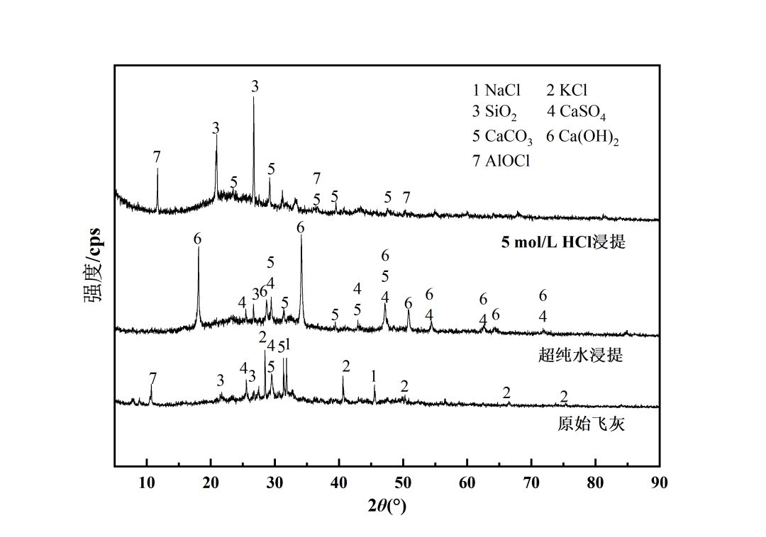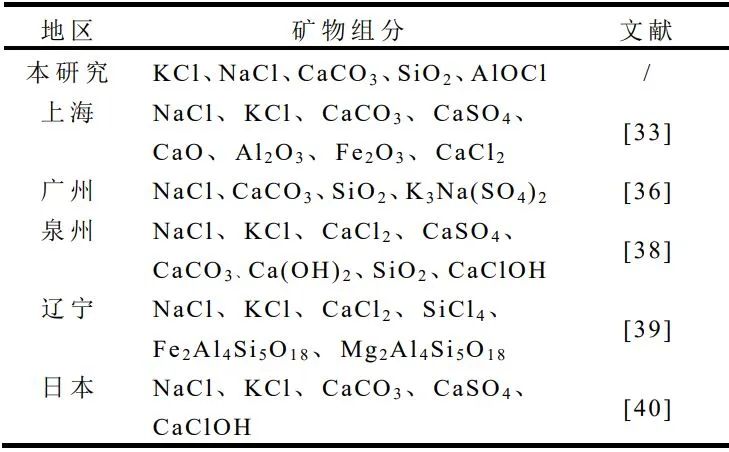 與不同地區(qū)飛灰礦物相組分對(duì)比,由表3可知,不同地區(qū)飛灰均含有碳酸鹽和硅酸鹽,且含有NaCl、KCl等可溶性氯鹽,Na、K元素來源于餐飲中食鹽等調(diào)味料的添加,高含量Cl-來源于爐排爐高溫焚燒下無機(jī)氯鹽的揮發(fā)以及垃圾成分中的廚余垃圾、塑料制品。相較于其他地區(qū),本研究還檢測(cè)到不溶氯AlOCl組分,可能是由于飛灰中Al2O3與焚燒煙氣中的酸性氣體反應(yīng)生成。