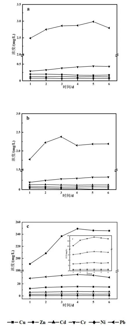 圖6 不同浸提劑下飛灰中重金屬的長(zhǎng)時(shí)間溶出(a: 1#超純水;b: 2#醋酸;c: 3# 5 mol/L HCl)