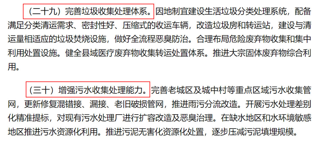 《意見》明確要求,要推進(jìn)縣城環(huán)境基礎(chǔ)設(shè)施提級擴(kuò)能,完善垃圾收集處理體系,因地制宜建設(shè)生活垃圾分類處理系統(tǒng);增強(qiáng)污水收集處理能力,完善重點(diǎn)區(qū)域污水收集管網(wǎng),推進(jìn)污泥無害化資源化處置。