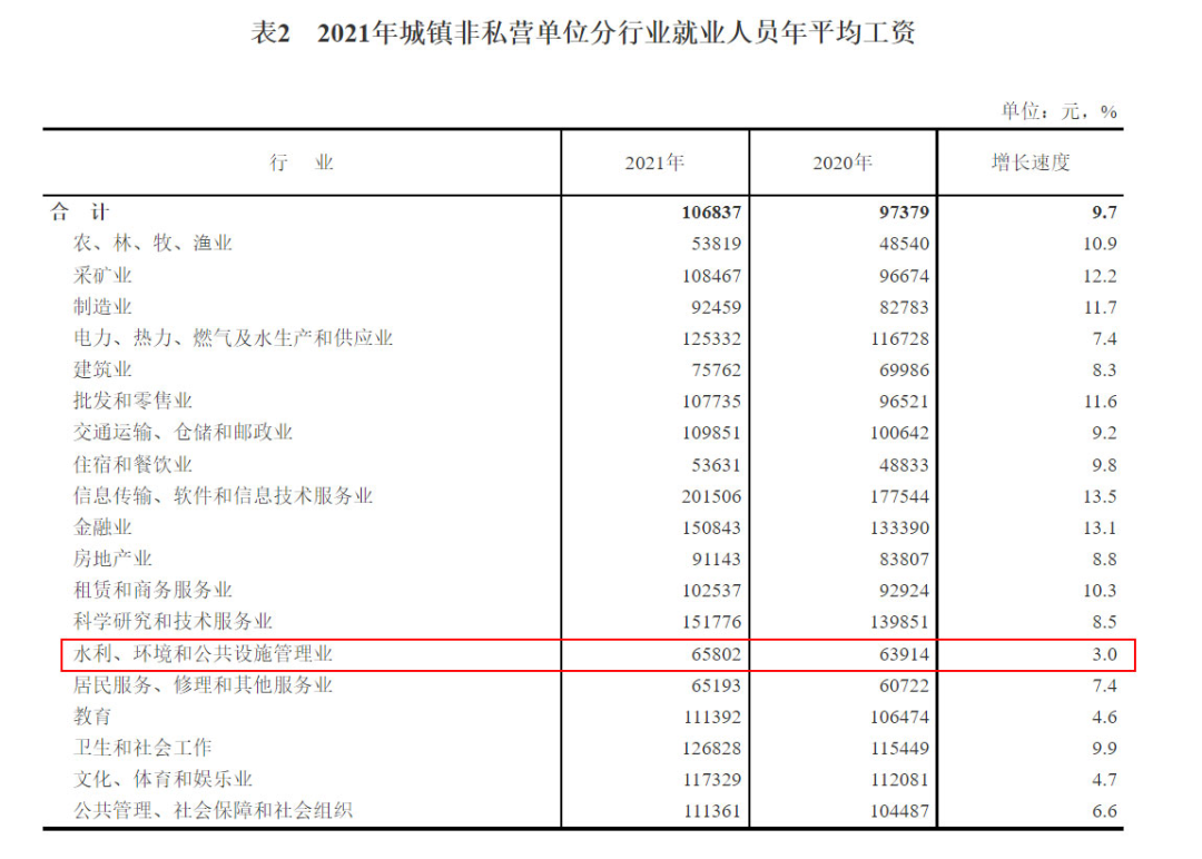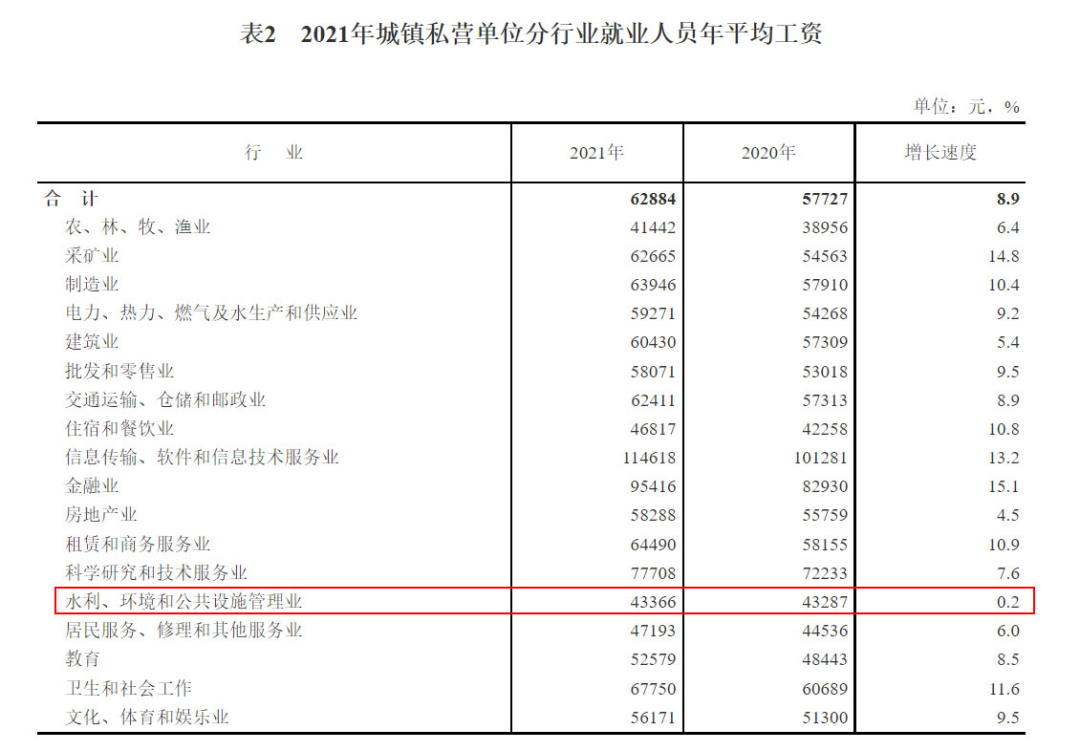 最近兩年,每到4-5月份,環(huán)保行業(yè)日子似乎都不好過。4月前后,年報發(fā)布季,一大波環(huán)保企業(yè)出現(xiàn)虧損,不好過。5月下旬,國家統(tǒng)計局照例又要發(fā)布上一年度的平均工資數(shù)據(jù),環(huán)保行業(yè)經(jīng)常排名墊底,又不好過。這不,5月20日,國家統(tǒng)計局就公布了2021年度的平均工資數(shù)據(jù),環(huán)保行業(yè)首次實現(xiàn)了收入增速的“雙墊底”(私營單位+非私營單位),增速還不如飽受疫情和政策影響的教育、餐飲和房地產(chǎn)業(yè),實在令人汗顏。而回顧過去5年,城鎮(zhèn)私營單位環(huán)保行業(yè)的收入增速就一直排名倒數(shù)。2017年倒數(shù)第一,2018年倒數(shù)第一,2019年和2020年倒數(shù)第二,2021年再次倒數(shù)第一,三次“第一”兩次“第二”(全是倒數(shù)),可謂“收入增速增長最緩慢行業(yè)”。為什么出現(xiàn)這一狀況?與環(huán)保行業(yè)的基本屬性有關。作為一個關系國計民生的重要行業(yè),環(huán)保行業(yè)注定不可能暴利,其業(yè)績的一大特點就是經(jīng)常“增收不增利”,從業(yè)人員的收入自然也就比較低了。5月20日,國家統(tǒng)計局公布了2021年城鎮(zhèn)單位就業(yè)人員的平均工資數(shù)據(jù)。這項數(shù)據(jù)主要分為3個榜單——城鎮(zhèn)非私營單位就業(yè)人員年平均工資、城鎮(zhèn)私營單位就業(yè)人員年平均工資,以及規(guī)模以上企業(yè)就業(yè)人員年平均工資。我們主要看的是前兩個榜單,非私營單位和私營單位的。榜單根據(jù)《國民經(jīng)濟行業(yè)分類》(GB/T4754-2017)對各行業(yè)進行了分類,環(huán)保行業(yè)屬于其中的“水利、環(huán)境和公共設施管理業(yè)”。今年的數(shù)據(jù),環(huán)保行業(yè)的最大特點是——首次實現(xiàn)了收入增速的“雙墊底”:非私營單位收入增速,環(huán)保行業(yè)3.0%,排名倒數(shù)第一;私營單位收入增速,環(huán)保行業(yè)0.2%,排名也是倒數(shù)第一。 而橫向對比其他行業(yè),可以看到——都比環(huán)保行業(yè)好。都說房地產(chǎn)業(yè)這兩年日子不好過,可人家的收入增速也有4.5%;都說教育業(yè)因為“雙減”涼涼了,可以人家的增速還有8.5%;都說住宿和餐飲業(yè)受疫情影響最大,可人家的增速竟然有10.8%。你說氣人不?整天哭著喊著的行業(yè)沒啥事,這邊一直默默無聞的環(huán)保行業(yè)一算賬卻來了個墊底。為啥環(huán)保行業(yè)的收入增速這么慢?官方給出的解釋是——隨著疫情防控成效顯現(xiàn),2021年大部分行業(yè)恢復性發(fā)展,但旅游業(yè)與景區(qū)收入恢復較慢,部分地區(qū)工資水平較低的環(huán)保、護林等公益性崗位增加較多,這些都拉低了水利環(huán)境和公共設施管理業(yè)的工資增長速度。