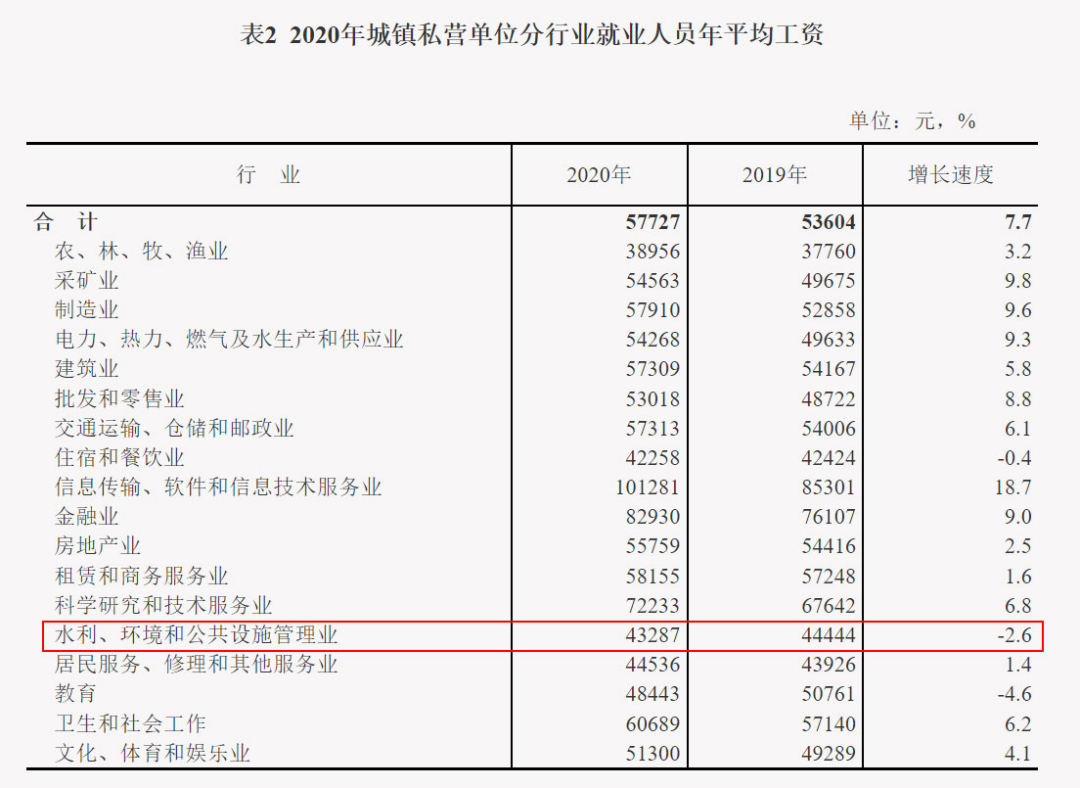 也就是說,主要原因是“部分地區(qū)工資水平較低的環(huán)保、護林等公益性崗位增加較多”,結果拉低了行業(yè)整體的工資增長速度。我的理解是,疫情背景下,城鎮(zhèn)非私營單位的環(huán)保崗位增加比較多,同時工資水平又比較低,所以導致了整個行業(yè)的收入增速放緩。事實上,如果把時間維度再拉長幾年觀察,可以發(fā)現(xiàn)——沒有最慘,只有更慘。比如,今年私營單位的收入增速,環(huán)保行業(yè)是0.2%,這個增速可以說是夠低了吧?都無限接近于0了。其實,去年更低,數(shù)字竟然是負的,-2.6%。也就是說,一年忙活下來,環(huán)保行業(yè)的平均工資非但沒有增長,竟然還倒退了2.6%。出于好奇,小編查了查過去n年國家統(tǒng)計局發(fā)布的平均工資數(shù)據(jù),結果發(fā)現(xiàn)了一個悲慘的事實。“城鎮(zhèn)私營單位就業(yè)人員年平均工資”這項數(shù)據(jù),從2016年以來,環(huán)保行業(yè)已經(jīng)連續(xù)5年排名倒數(shù)!2021年,0.2%,倒數(shù)第一;