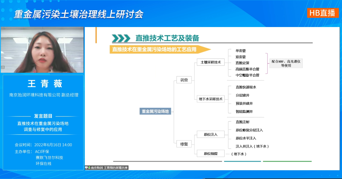 南京貽潤環(huán)境科技有限公司副總經(jīng)理王青薇介紹了直推技術(shù)在重金屬污染場地調(diào)查與修復(fù)中的應(yīng)用。王總介紹,直推技術(shù)是指通過直推式鉆機(jī)將內(nèi)附采樣器、傳感器的鉆桿通過推進(jìn)、沖擊或振動的方式貫入地層,以快速采集代表性的土壤、土壤氣體和地下水樣品,或通過所裝備的檢測儀器獲取相關(guān)數(shù)據(jù)的技術(shù)總稱。王總介紹了南京貽潤的EP1000系列便攜式、履帶式直推鉆機(jī)、EP2000系列履帶式直推鉆機(jī)、EP4000C履帶式直推鉆機(jī)以及EP3080工作站,及其在土壤調(diào)查采樣中應(yīng)用。