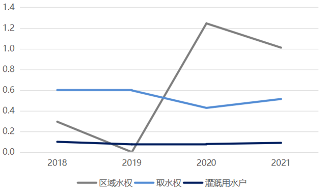從成交價(jià)格來(lái)看,2021年三種交易類(lèi)型相比2020年變化均不大,區(qū)域水權(quán)交易雖從約1.2元/方跌至約1.0元/方,但仍然大幅高于其它交易類(lèi)型;取水權(quán)交易從約0.4元/方小幅上漲至約0.5元/方;灌溉用水戶(hù)交易自2018年來(lái)均保持在約0.1元/方的價(jià)格水平。不同交易類(lèi)型之間的價(jià)格差異仍然明顯。