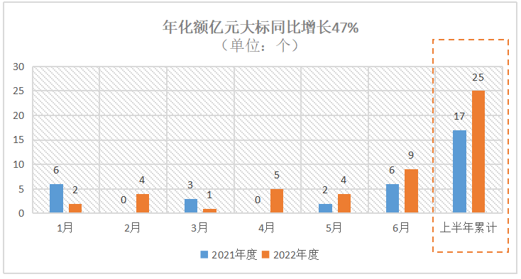截止6月25日,2022年上半年累計(jì)開標(biāo)年化額超億元環(huán)衛(wèi)大標(biāo)總數(shù)達(dá)25個,同比增長47%。去年同期開標(biāo)年化額超億元環(huán)衛(wèi)大標(biāo)總數(shù)為17個。