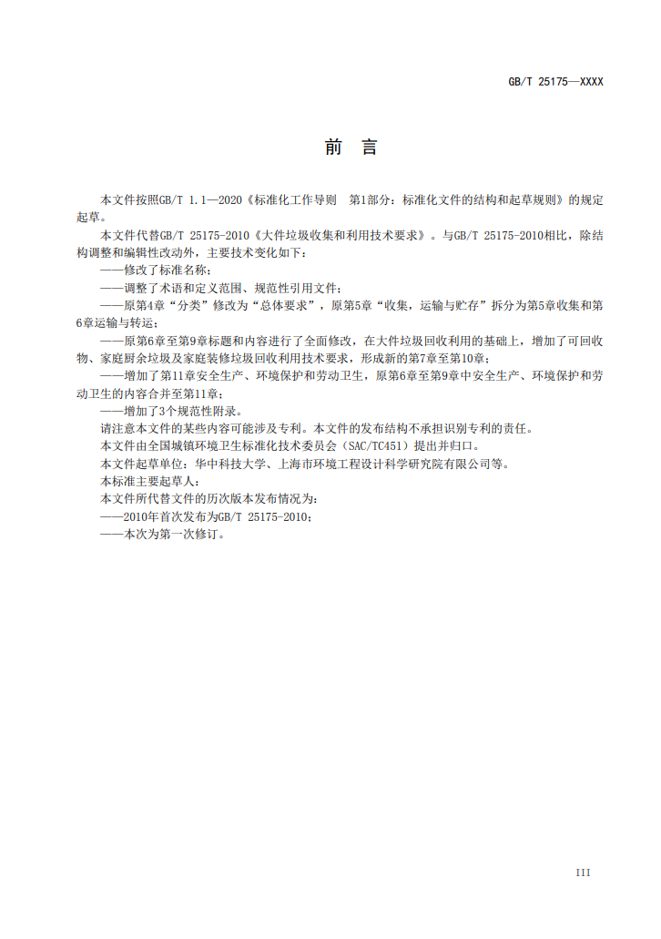 由于標(biāo)準(zhǔn)系由大件垃圾國(guó)標(biāo)修訂而來,因此首先在術(shù)語部分進(jìn)行了修改,對(duì)“可回收物”、“家庭廚余垃圾”、“大件垃圾”、“家庭裝修垃圾”、“分揀中心”和“殘余物”六項(xiàng)做出定義。