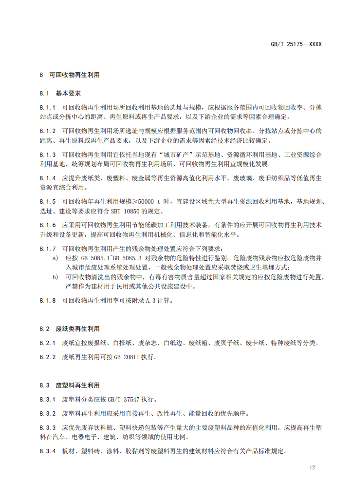 對(duì)于可回收物再生利用,標(biāo)準(zhǔn)提出如下基本要求: