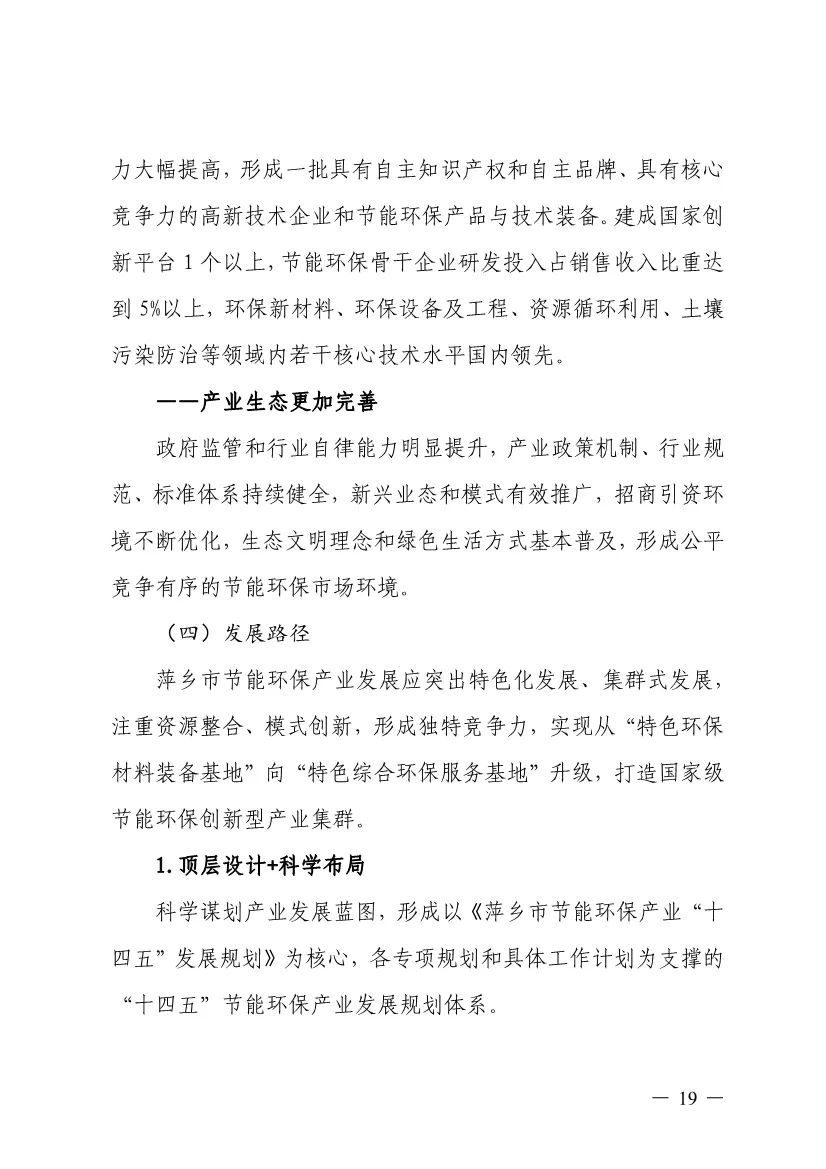 “十四五”期間,組建1-2個(gè)環(huán)保集團(tuán),以增強(qiáng)對(duì)國際先進(jìn)技術(shù)裝備服務(wù)的承接能力,著力突破一批關(guān)鍵核心技術(shù),強(qiáng)化集成應(yīng)用示范,形成具有自主知識(shí)產(chǎn)權(quán)的整裝成套技術(shù)裝備,大幅提升節(jié)能環(huán)保技術(shù)和成套裝備本地化率,打造區(qū)域特色鮮明的湘東節(jié)能環(huán)保產(chǎn)業(yè)園。