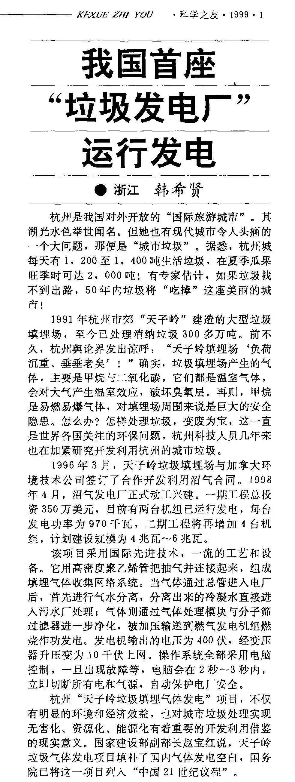 據(jù)當時的媒體報道,1996年3月,天子嶺垃圾填埋場與一家加拿大公司簽訂了合作開發(fā)利用沼氣合同。1998年4月,沼氣發(fā)電廠正式動工興建。一期工程總投資350萬美元,安裝兩臺發(fā)電機組,每臺發(fā)電功率為970千瓦,二期工程將再增加4臺機組,計劃建設規(guī)模為4~6兆瓦。報道原文表示,杭州“天子嶺垃圾填埋氣體發(fā)電”項目不僅有明顯的環(huán)境和經(jīng)濟效益,也對城市垃圾處理實現(xiàn)無害化、資源化、能源化有著重要的開發(fā)利用借鑒的現(xiàn)實意義。時任原建設部副部長的趙寶紅說,天子嶺垃圾氣體發(fā)電項目填補了國內(nèi)氣體發(fā)電空白,國務院已將這一項目列入“中國21世紀議程”。天子嶺垃圾填埋場的設計、施工、運維及其在滲濾液處理、沼氣發(fā)電等方面的一系列創(chuàng)新,堪稱是中國生活垃圾衛(wèi)生填埋技術發(fā)展史的一部“縮影”。在1990年代前后,國內(nèi)先后建成了上海老港生活垃圾填埋場、蘇州市七子山生活垃圾填埋場、濟南市生活垃圾無害化處理廠等一批大型生活垃圾衛(wèi)生填埋設施,導引著中國生活垃圾處理進入“衛(wèi)生填埋”新時代。而在那之前,我們的生活垃圾還只能簡單堆放、簡易填埋,甚至直接傾倒入河流、海洋。可以說,生活垃圾“衛(wèi)生填埋”是國內(nèi)首個徹底改變?nèi)珖罾幚憩F(xiàn)狀的新技術,地位絕不啻于后來風行的垃圾焚燒發(fā)電。從1991年到2020年,包括一埋場和二埋場在內(nèi),整個天子嶺垃圾填埋場總計處理生活垃圾近3000萬噸。隨著杭州市生活廢棄物管理轉(zhuǎn)型升級,杭州市生活垃圾處理逐漸形成“焚燒為主、資源化為輔、填埋為保障”的新格局。2020年12月16日23時58分,隨著最后一張覆蓋膜的密閉完成,天子嶺垃圾填埋場正式結束填埋主力的角色。