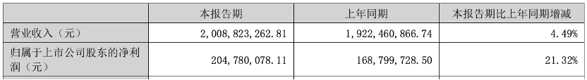公司上半年?duì)I業(yè)收入為20.09億元,同比增長(zhǎng)4.49%;歸屬于上市公司股東的凈利潤(rùn)為2.05億元,同比增長(zhǎng)21.32%。