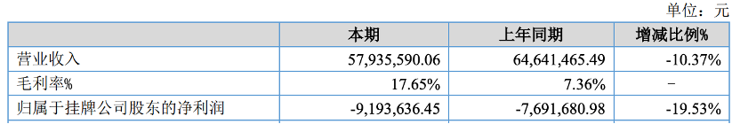 公司上半年?duì)I業(yè)收入為57,935,590.06元,同比下降10.37%;歸屬于掛牌公司股東的凈利潤(rùn)-9,193,636.45元,同比下降19.53%。