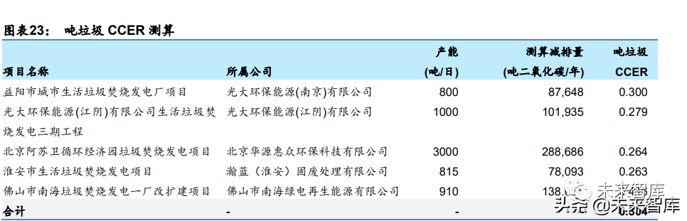 CCER 項(xiàng)目在傳統(tǒng)項(xiàng)目盈利模式基礎(chǔ)上帶來附加收入,增厚利潤空間。垃圾焚燒發(fā)電項(xiàng)目 主要在以下兩個(gè)方面實(shí)現(xiàn)了碳減排:(1)焚燒替代填埋,減少了因填埋產(chǎn)生的甲烷。(2) 焚燒發(fā)電替代火力發(fā)電,生產(chǎn)相同電量下的碳排放量相對更少。選取中國自愿減排交易信 息平臺上披露減排量的垃圾焚燒項(xiàng)目,可以計(jì)算出每噸垃圾產(chǎn)出的 CCER 約為 0.3 噸,同 時(shí)根據(jù)復(fù)旦大學(xué)可持續(xù)發(fā)展研究中心的數(shù)據(jù),目前 CCER 的買入價(jià)格預(yù)期約為 60 元/噸, 對應(yīng)每噸垃圾可帶來的增量收入約為 18 元。噸垃圾處置費(fèi)取 2021 年行業(yè)平均值 87.9 元/ 噸,噸垃圾上網(wǎng)電量取 2021 年上市公司平均數(shù)據(jù)進(jìn)行測算,CCER 在收入/利潤端可為項(xiàng) 目帶來約 6.4%/28.7%的增厚空間。在國補(bǔ)減少 30%情況下,CCER 在收入/利潤端仍可帶 來 1.9%/8.6%的增厚空間。