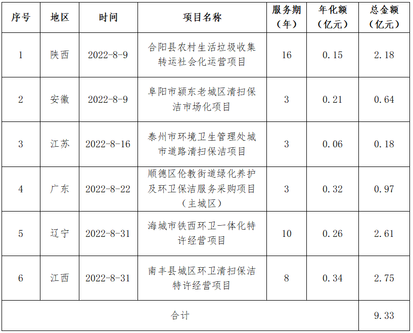 其中最典型的就是山東省德州市寧津縣城鄉(xiāng)環(huán)衛(wèi)一體化及綠化提升項(xiàng)目,該項(xiàng)目服務(wù)期為20年,第一至第二年合同額預(yù)估為5682萬元,第三至二十年合同額預(yù)估為13.4514億元,合計(jì)金額14.0196億元。項(xiàng)目服務(wù)范圍包括但不限于寧津縣10座鄉(xiāng)鎮(zhèn)垃圾轉(zhuǎn)運(yùn)站的升級(jí)改造以及新建鄉(xiāng)鎮(zhèn)生活垃圾分類處理項(xiàng)目,鄉(xiāng)鎮(zhèn)駐地及國(guó)省干道綠化提升工程以及縣城綠化提升工程(包括福寧河公園提升改造、道路綠化及小游園提升改造、康寧湖提升改造工程)及其他環(huán)衛(wèi)服務(wù)。據(jù)環(huán)衛(wèi)科技網(wǎng)粗略統(tǒng)計(jì),北控城市環(huán)境今年已中標(biāo)近20個(gè)環(huán)衛(wèi)項(xiàng)目,合計(jì)中標(biāo)金額超過48億元。在年度排行榜上,目前僅次于盈峰環(huán)境和僑銀股份,排在第三的位置。● 盈峰vs僑銀,年度冠軍之爭(zhēng)日趨白熱化進(jìn)入2022年,盈峰環(huán)境和僑銀股份兩家環(huán)衛(wèi)龍頭企業(yè)延續(xù)了以往的強(qiáng)勢(shì),幾乎每個(gè)月度排行都榜上有名。8月,盈峰環(huán)境和僑銀股份再次上榜,分別排在第5和第7的位置。盈峰環(huán)境當(dāng)月中標(biāo)6個(gè)環(huán)衛(wèi)項(xiàng)目,尤其在最后一天同時(shí)拿下遼寧省海城市鐵西環(huán)衛(wèi)一體化和江西省南豐縣城區(qū)環(huán)衛(wèi)清掃保潔兩個(gè)特許經(jīng)營(yíng)項(xiàng)目,南北“雙響”收獲5.36億元。表3 盈峰環(huán)境8月中標(biāo)項(xiàng)目匯總