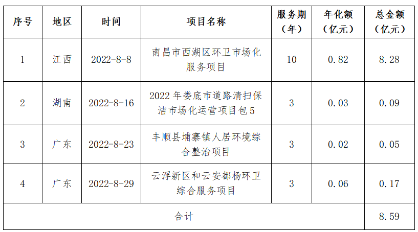 僑銀股份當(dāng)月則中標(biāo)4個(gè)環(huán)衛(wèi)項(xiàng)目,其中南昌市西湖區(qū)環(huán)衛(wèi)市場(chǎng)化服務(wù)項(xiàng)目,服務(wù)期10年,總金額達(dá)到8.28億元。表4 僑銀股份8月中標(biāo)項(xiàng)目匯總