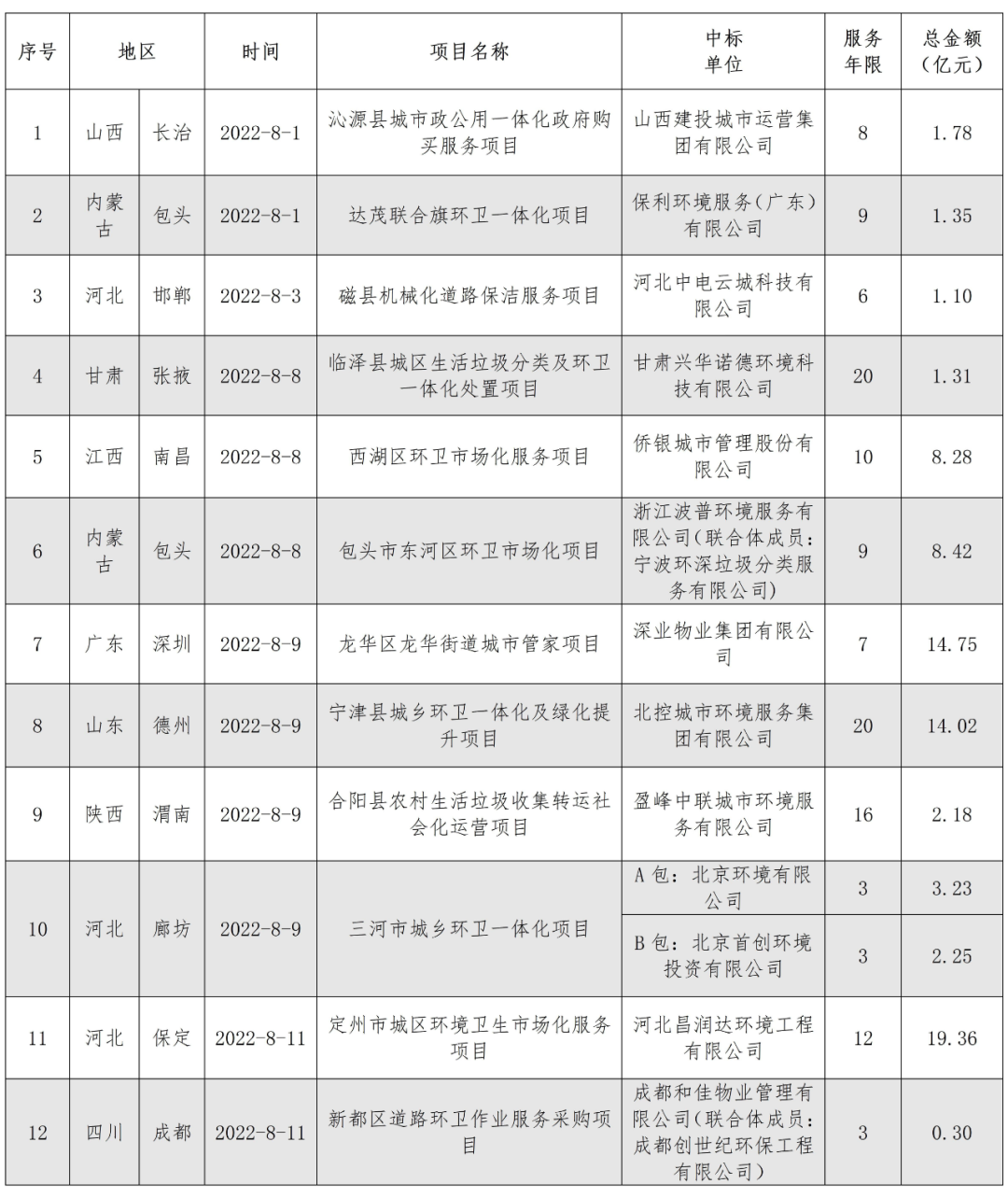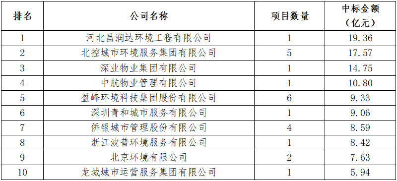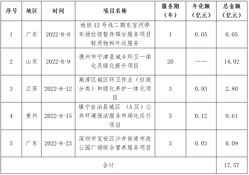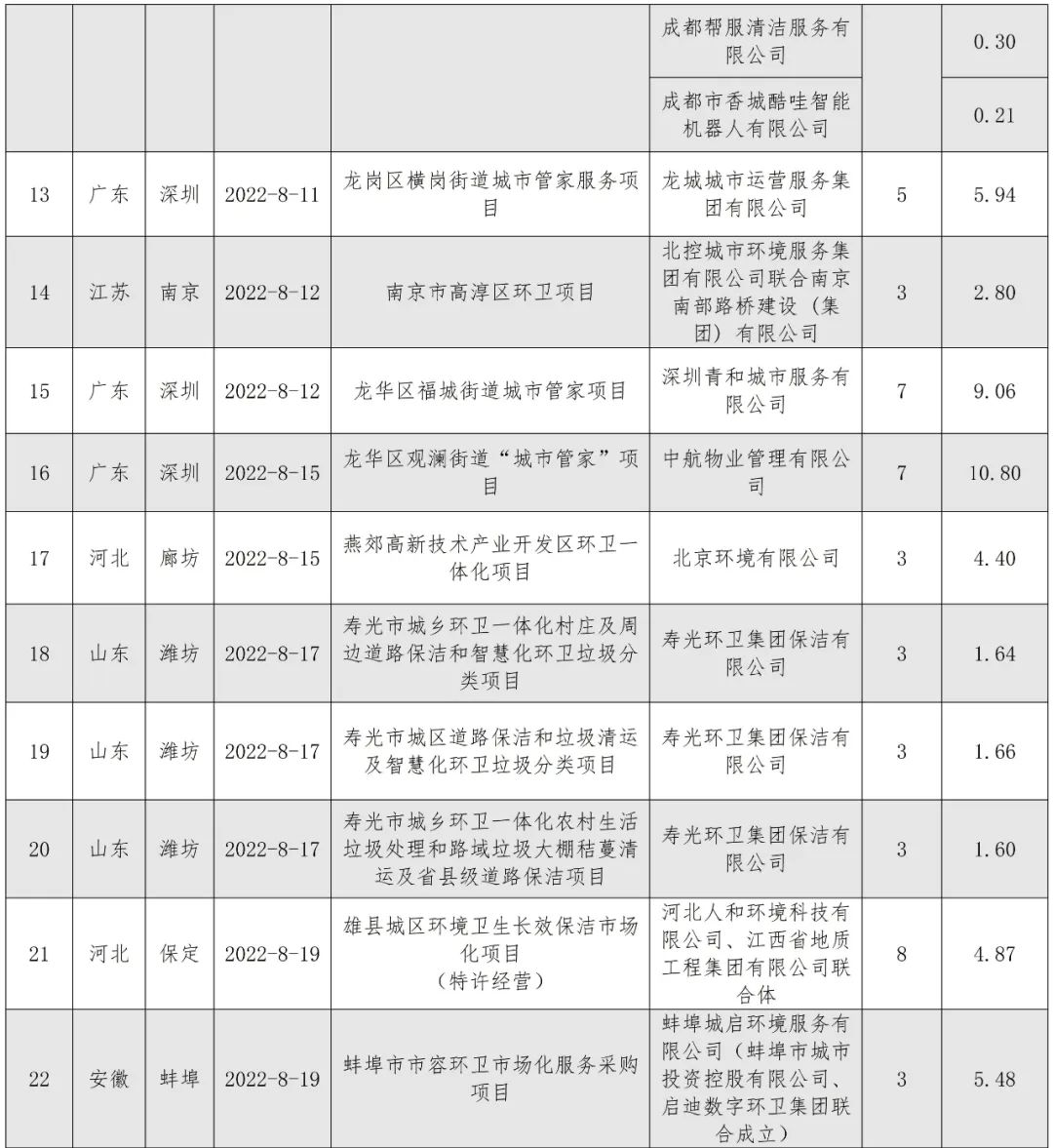 8月,河北昌潤(rùn)達(dá)環(huán)境工程有限公司憑借19.36億元的定州市城區(qū)環(huán)境衛(wèi)生市場(chǎng)化服務(wù)項(xiàng)目登頂企業(yè)月度排行榜榜首。定州市城區(qū)環(huán)境衛(wèi)生市場(chǎng)化服務(wù)項(xiàng)目特許經(jīng)營(yíng)期12年。服務(wù)范圍為河北省定州市市區(qū)西城、北城、南城、長(zhǎng)安辦、經(jīng)濟(jì)開發(fā)區(qū)及高速高鐵站主次干道、小街巷、商業(yè)街區(qū)、便民市場(chǎng)和市區(qū)水域,清掃保潔總面積9617672.66平方米,項(xiàng)目負(fù)責(zé)公共區(qū)域生活垃圾(不含物業(yè)小區(qū)其他垃圾)產(chǎn)生量每天200~260噸。昌潤(rùn)達(dá)以1.61億元/年的投標(biāo)報(bào)價(jià)位中標(biāo)該項(xiàng)目。昌潤(rùn)達(dá)成立于2014年8月,位于保定市國(guó)家大學(xué)科技園8號(hào)樓,是河北省首批成立的一家集垃圾分類、城鄉(xiāng)環(huán)衛(wèi)一體化、公用設(shè)施管理維護(hù)、農(nóng)村廁改與吸污處理、智慧環(huán)衛(wèi)等多位一體的科技型環(huán)衛(wèi)一體化大型集團(tuán),系中國(guó)清潔服務(wù)行業(yè)百?gòu)?qiáng)企業(yè)。昌潤(rùn)達(dá)是一家典型的立足本土的環(huán)衛(wèi)企業(yè),其服務(wù)區(qū)域主要集中在保定市及周邊縣、區(qū)和邯鄲市部分縣鄉(xiāng)村。2021年8月,知名物企佳兆業(yè)美好曾宣布擬以3.67億元的價(jià)格收購(gòu)昌潤(rùn)達(dá)70%的股權(quán),但最終因“公司經(jīng)營(yíng)策略調(diào)整”,交易在年底告吹。從今年中標(biāo)的項(xiàng)目來看,昌潤(rùn)達(dá)似乎還沒有準(zhǔn)備走出河北,依舊在深耕自己的“一畝三分地”。● 北控城市環(huán)境連下五城,全年項(xiàng)目金額超48億元8月,北控城市環(huán)境迎來一波拿標(biāo)高潮,連續(xù)中標(biāo)5個(gè)環(huán)衛(wèi)項(xiàng)目,合計(jì)中標(biāo)金額達(dá)17.57億元,一舉拿下榜眼位置。表2 北控城市環(huán)境8月中標(biāo)項(xiàng)目匯總
