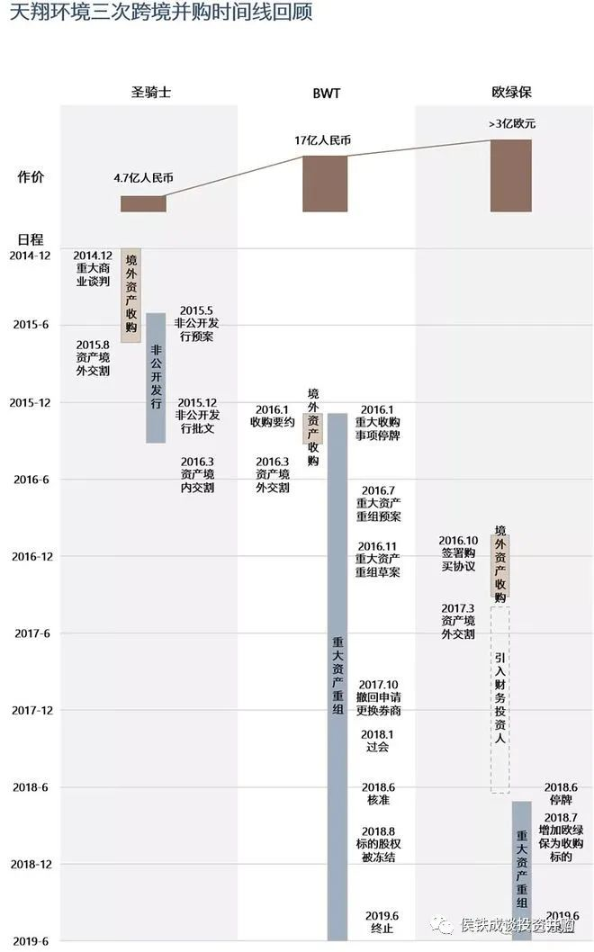 原本的十大并購案例,寫著寫著寫成了十大環(huán)保并購慘案。為了緩解大家失落悵惘的心情,免費(fèi)奉上一個跌到谷底的案子,大家再忍一忍,黎明前的黑暗。本文為環(huán)保十大并購案例之五,天翔環(huán)境海外收購圣騎士、BWT、歐綠保,最終公司破產(chǎn)退市。我們之前看的幾個并購失敗案例,雖然也都是十年苦心經(jīng)營,毀于一旦,但大部分只是元?dú)獯髠?,主營業(yè)務(wù)利潤虧光,大股東黯然離場而已。今天的案例,并購的后果是上市公司破產(chǎn)退市,大股東債務(wù)纏身被檢查機(jī)關(guān)起訴,員工債權(quán)人均蒙受巨大損失。里里外外大幾十億的虧損,堪稱“環(huán)保上市公司十年內(nèi)最大的慘案”。歡迎大家多提寶貴意見。尋找底層規(guī)律,帶動行業(yè)發(fā)展,避免低級錯誤重現(xiàn)。幾經(jīng)掙扎的天翔環(huán)境最終還是在2021年8月30日迎來了被深交所摘牌的結(jié)局。天翔環(huán)境原名天保重裝,原主業(yè)為大型節(jié)能環(huán)保及清潔能源設(shè)備,具體包括分離機(jī)械系列設(shè)備和水輪發(fā)電機(jī)組設(shè)備,并于2014年完成上市。當(dāng)時,天翔環(huán)境的主營已露疲態(tài),上市當(dāng)年收入下滑超過30%,公司開始尋找轉(zhuǎn)型方向。2015年開始,天翔環(huán)境通過連續(xù)的大手筆并購進(jìn)軍環(huán)保領(lǐng)域,先后以4.7億收購美國的污泥處理設(shè)備公司圣騎士、17億收購德國的水處理公司BWT,并在隨后迎來了自己的高光時刻,2016年底,其市值來到了107.5億的歷史最高值。好景不長,因為體外并購未能裝入上市公司,導(dǎo)致了一系列問題,悲劇大幕就此拉開。2018年,天翔環(huán)境在年報中披露,控股股東直接控制的成都親華科技有限公司非經(jīng)營性資金占用24.55億,而當(dāng)時天翔環(huán)境本身的債務(wù)逾期金額已達(dá)到17.58億。從此,天翔環(huán)境股價持續(xù)下跌,直至2021年8月30日最終被深交所摘牌。回顧天翔環(huán)境的發(fā)展歷程,核心是三次海外收購,分別是2014年12月收購的美國圣騎士,2016年1月收購的BWT公司,2016年10月收購的歐綠保,交易金額預(yù)期超過3億歐元。其中第一個交易順利完成,后面兩個交易只完成了體外收購,并沒有完成裝入上市公司的動作,最終也導(dǎo)致了上市公司與大股東的相繼崩盤。第一筆收購,公司與券商聯(lián)合成立基金,收購標(biāo)的公司。然后上市公司非定向增發(fā),募集資金收購基金持股。收購與定增并行推進(jìn),加快交易節(jié)奏,順利地完成了交易。這個案子金額相對小,方案謹(jǐn)慎,交易結(jié)構(gòu)簡單,資本市場當(dāng)時資金充足,因此完成相對容易些。企業(yè)由此嘗到了甜頭,默認(rèn)為其他項目也可以先收購,再定增裝入上市公司。2016年2月,僅僅在上市公司剛剛完成非公開發(fā)行一個月、圣騎士股權(quán)尚未完成交割之時,天翔環(huán)境又再次啟動了對更大的收購標(biāo)的——估值達(dá)到2.2億歐元的德國水處理公司BWT。因為交易時間緊張,天翔和基金先籌集資金收購,然后再由大股東組建資金替代基金,大股東向其他人承諾兜底,最終由上市公司定增完成收購。在當(dāng)時的背景下,是有很多基金愿意參與并購定增,同時也默認(rèn)定增即可賺錢的邏輯,愿意參與這種有一定風(fēng)險的投資。基金的收益在于定增后的股價增值,以及定增不成的大股東保底,風(fēng)險在于定增后股價下跌,定增失敗后大股東無法保底。當(dāng)時環(huán)境下,基金方總體上還是認(rèn)為風(fēng)險收益匹配的。這種情況跟當(dāng)時的熱錢有關(guān),即大部分資金來自信托,錢多無處可投。當(dāng)時的資金投資邏輯并不穩(wěn)定,是一種特殊情況。但第二筆收購出現(xiàn)了問題,監(jiān)管機(jī)構(gòu)審核達(dá)2年之久。兩個原因,一個是券商的原因,一個是資金的來源問題。最終獲得批文的時間已經(jīng)是2018年6月。雪上加霜的是,公司在這筆交易尚未完成之際,大股東又組團(tuán)以3億歐元的價格收購了更大的一家歐洲垃圾處理公司,同樣無法完成交易。這個時候大股東和上市公司都扛不住了,體外并購的杠桿利息,疊加當(dāng)時嚴(yán)厲“去杠桿”的外部環(huán)境以及上市公司的PPP業(yè)務(wù)占用大量資金無法回收,跌跌不休的股價最終帶崩了大股東以及上市公司的債務(wù)崩盤。2018年8月,大股東企業(yè)親華科技持有中德天翔20.59%的股份被債權(quán)人凍結(jié),導(dǎo)致上市公司收購中德天翔的交易無法完成交割。2019年1月24日上市公司公告收到證監(jiān)會立案調(diào)查通知書,此時天翔環(huán)境大股東因債務(wù)危機(jī)侵占上市公司資金已經(jīng)公開。2019年6月19日,天翔環(huán)境公告終止收購中德天翔以及歐綠保的交易,大股東的過橋基金退出失敗,天翔環(huán)境開始自由解體。公司2021年年報披露,在2020年8月收到鄧親華及一致行動人鄧翔提供的成都市公安局出具 的《取保候?qū)彌Q定書》,2021年1月19日,公司、鄧親華、鄧翔被移送成都市人民檢察院審查起訴。整個故事中,公眾號“文藝馥欣”做了精彩的分析和點(diǎn)評,上述配圖和部分?jǐn)⑹鰜碓从谄涔娞栁恼?,文末有相關(guān)鏈接。本案整個過程也比較清晰,公司上市后謀求發(fā)展轉(zhuǎn)型,先定增10億人民幣,發(fā)行收購了美國圣騎士公司,然后打算采用收購美國