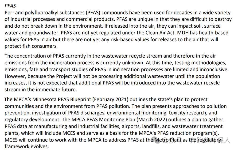 明尼蘇達(dá)污泥焚燒項目四期的環(huán)境評估表中可以發(fā)現(xiàn),美國對污泥焚燒中PFAS(全氟和多氟烷基物質(zhì))的排放也已經(jīng)開始關(guān)注。