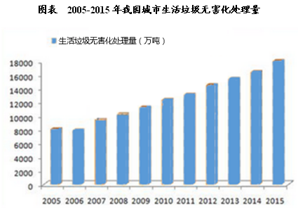 2005-2015年間,我國城市生活垃圾無害化處理量年均復合增長率(CAGR)為8.38%。