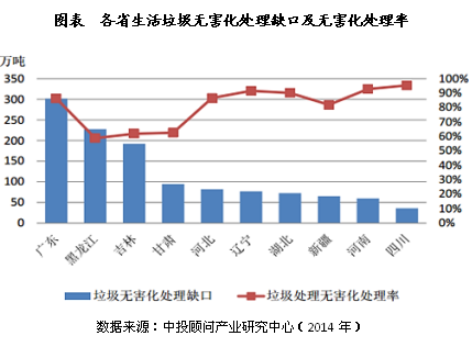 截至2015年,共建設生活垃圾無害化處理廠(場)890座,其中填埋場640座,焚燒廠220座,堆肥及其他類型處理廠(場)30座。
