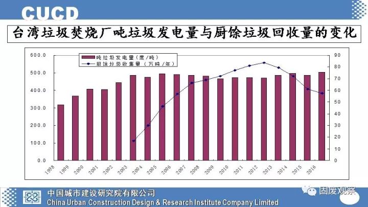下面這張圖可以看出臺(tái)灣地區(qū)的廚余回收量的變化對(duì)焚燒發(fā)電效率的影響基本沒有。臺(tái)灣地區(qū)雖然聲稱廚余垃圾分類收集做得好,但廚余垃圾的回收利用要明顯落后,臺(tái)灣第一個(gè)廚余垃圾厭氧處理廠今年才動(dòng)工,計(jì)劃2018年底才能投入運(yùn)營。
