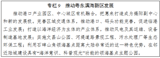 產(chǎn)業(yè)發(fā)展。積極推進(jìn)揭陽大南海石化工業(yè)區(qū)、風(fēng)能成套裝備產(chǎn)業(yè)園、海洋高端裝備產(chǎn)業(yè)園等平臺(tái)建設(shè);重點(diǎn)發(fā)展石化、新材料、電力、裝備制造、生物醫(yī)藥、電子信息、現(xiàn)代漁業(yè)等產(chǎn)業(yè);加快度假、養(yǎng)生、養(yǎng)老等旅游產(chǎn)品開發(fā),推進(jìn)靖海等地區(qū)海水增養(yǎng)殖發(fā)展。在神泉、靖海海域布局海上風(fēng)電。