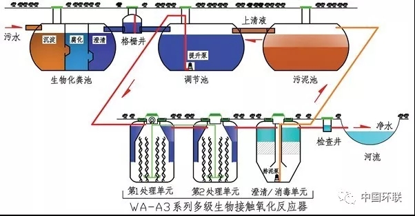 工藝流程:農(nóng)村生活污水流經(jīng)化糞池沉淀,格柵井去雜質(zhì)后進(jìn)入“多級(jí)生物接觸氧化反應(yīng)器”進(jìn)過(guò)氧化、沉淀、深度澄清處理后達(dá)標(biāo)排放。