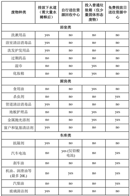 家庭危險(xiǎn)廢物包括漂白劑、花園和泳池用化學(xué)品、油漆、溶劑等。居民可打電話給市政部門上門收集,或包裝好送往資源處理中心,但處理都會(huì)收費(fèi)。每年每個(gè)區(qū)域(類似我們的街道)都會(huì)有兩三次免費(fèi)日,在這幾天送危險(xiǎn)廢物將不收費(fèi)。由于危險(xiǎn)廢物種類繁多,為了便于居民區(qū)分這類廢物與其它廢物,市議會(huì)有詳細(xì)的垃圾投放指導(dǎo),如表2所示。
