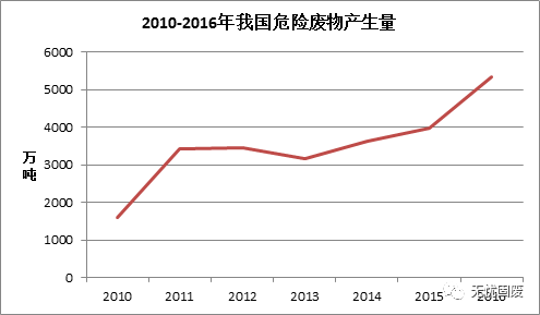 工業(yè)行業(yè)是我國(guó)危險(xiǎn)廢物的主要來源,根據(jù)2017中國(guó)統(tǒng)計(jì)年鑒顯示,2016年全國(guó)工業(yè)危險(xiǎn)廢物產(chǎn)生量為5347.3萬噸,同比增長(zhǎng)34.49%。