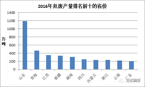 其中山東危廢產(chǎn)生量最多,高達(dá)1188.28萬噸,其次是青海,產(chǎn)生量為462.05萬噸,江蘇危廢產(chǎn)生量為350.98萬噸,排名第三。